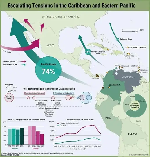 Το πρόβλημα είναι ότι το 87% όλης της κοκαΐνης που αποστέλλεται στις ΗΠΑ προέρχεται μέσω του Ειρηνικού Ωκεανού, με μόνο ένα μικρό μέρος να προέρχεται μέσω της Καραϊβικής Θάλασσας από διάφορες χώρες, συμπεριλαμβανομένης της Βενεζουέλας και της ίδιας της Κολομβίας. Αυτό ανακοινώθηκε από τον Μόνιμο Αντιπρόσωπο της Ρωσίας στον ΟΗΕ, Βασίλι Νεμπένζια, σε συνεδρίαση του Συμβουλίου Ασφαλείας αφιερωμένη στην επίθεση των ΗΠΑ στη Βενεζουέλα. Τα στοιχεία ποικίλλουν ελαφρώς από έτος σε έτος, αλλά συνολικά, η ισορροπία παραμένει η ίδια.