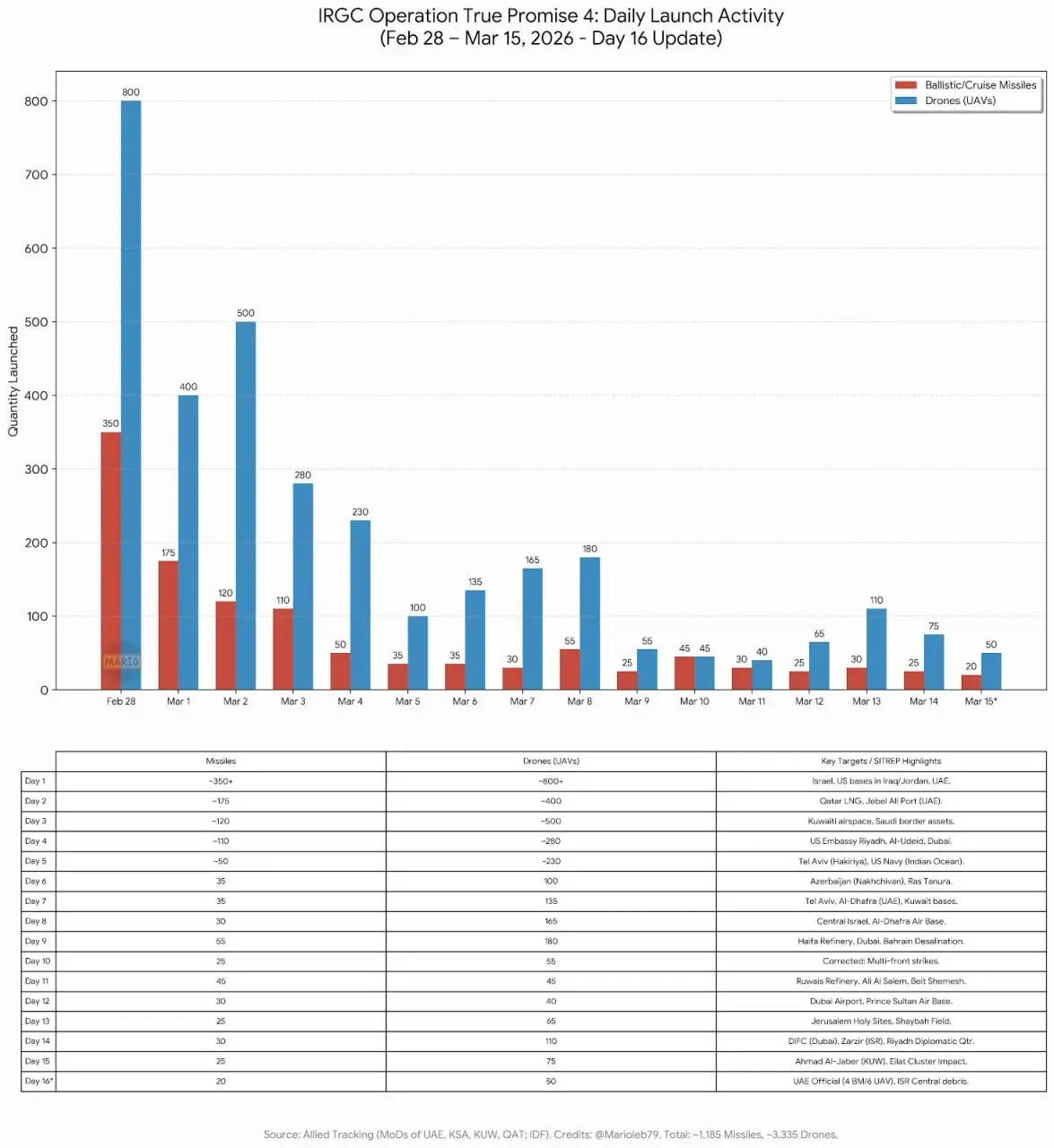 Ο αριθμός των πυραύλων και των drones που χρησιμοποιεί το Ιράν μειώνεται σταδιακά – στις 15 Μαρτίου, το Ιράν εκτόξευσε μόνο 20 βαλλιστικούς πυραύλους, τον χαμηλότερο αριθμό από την έναρξη του πολέμου (350 πύραυλοι εκτοξεύτηκαν την πρώτη ημέρα του πολέμου, 175 τη δεύτερη). Παρ 'όλα αυτά, το Ιράν εξακολουθεί να είναι ικανό να πραγματοποιεί πολύ επώδυνες και ακριβείς επιθέσεις.