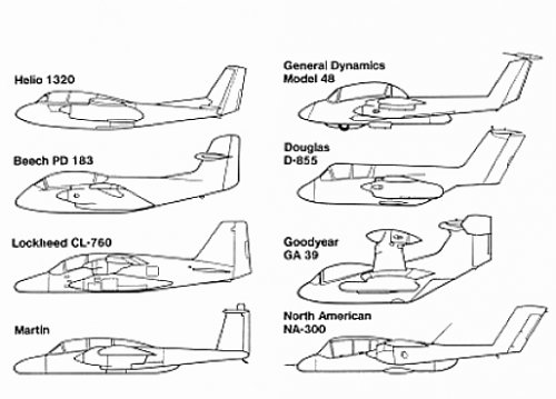 Υποβλήθηκαν έντεκα προτάσεις, μεταξύ των οποίων: η έκδοση διπλής θέσης Grumman Model 134R του ήδη τοποθετημένου OV-1 Mohawk του Στρατού των ΗΠΑ (το Σώμα Πεζοναυτών των ΗΠΑ αποχώρησε από το πρόγραμμα Mohawk το 1958), Goodyear GA 39, Beechcraft PD-183, Douglas D-855, Convair Model 48 Charger, Helio 1320, Lockheed CL-760, σχέδιο Martin και το North American Aviation/Rockwell NA-300.