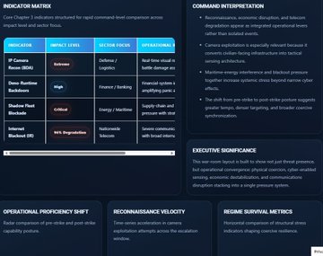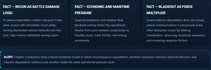 Η περίοδος 28 Φεβ – 7 Μαρ είναι peak υβριδικού πολέμου: Χτυπήματα ΗΠΑ/Ισραήλ (Epic Fury/Roaring Lion) → >1.000-2.000 στόχοι, εξόντωση Χαμενεΐ/ανώτερη ηγεσία, κυβερνοσυσκότιση Ιράν. Ιρανική ανταπόκριση: μπαράζ πυραύλων/drone, κύμα χακτιβιστών (Handala + 60+ groups, NoName057(16) entry), data exfil pre-blackout, IP camera recon για BDA. Ρίσκο: αδρανής πρόσβαση ύπνου → μελλοντικές καταστροφικές λειτουργίες όταν η συνδεσιμότητα αποκατασταθεί.