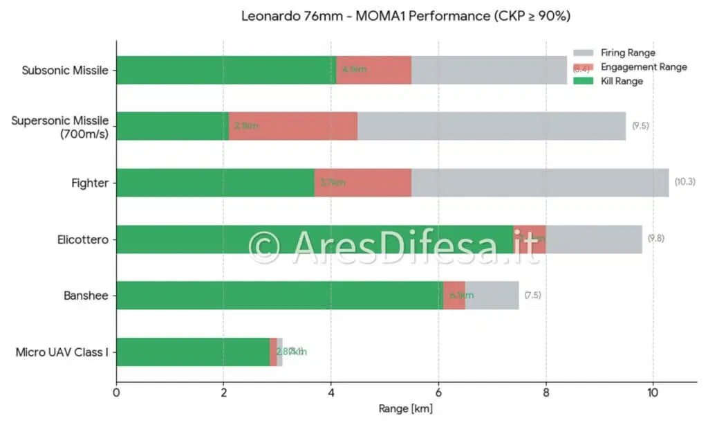Σύμφωνα με τον Λεονάρντο, η κύρια πρόκληση δεν είναι τόσο η καταστροφή εχθρικών drones όσο η εντοπιότητά τους, και το Τακτικό Πολλαπλών Αποστολών Ραντάρ (TMMR) ζώνης C της εταιρείας απέδωσε πολύ καλά σε μια επίδειξη: ένα βλήμα 76 χιλιοστών κατέστρεψε πολλαπλά drones όταν στόχευε ένα σμήνος, ένα διαμέτρημα που είναι ακόμη και υπερβολικό έναντι ορισμένων τύπων UAV.