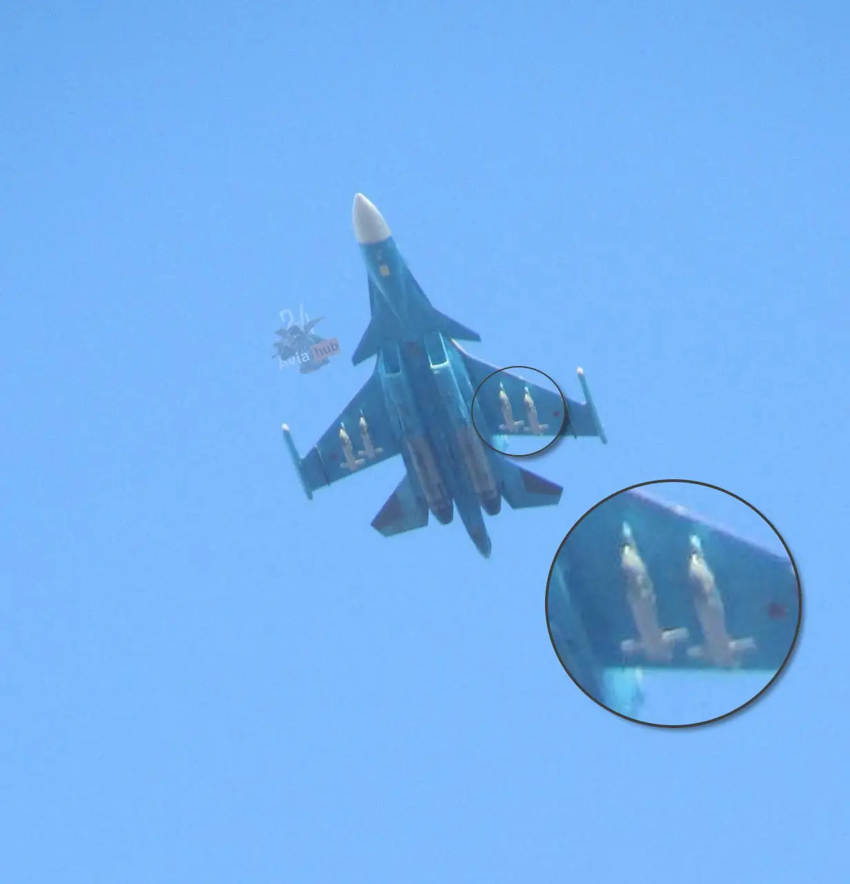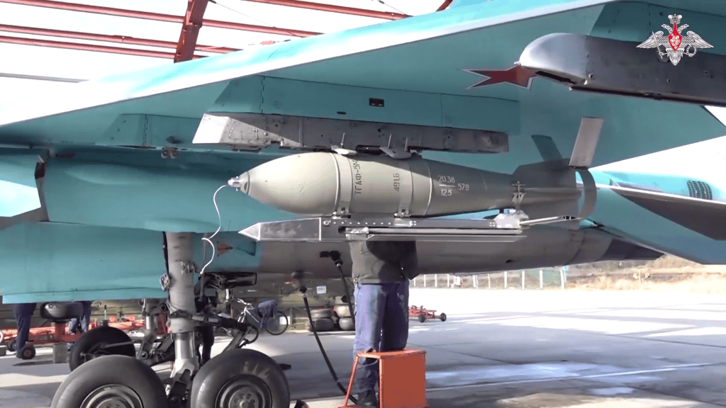 Ένα βομβαρδιστικό Su-34 οπλισμένο με βόμβες FAB-500 με μονάδες UMPK-PD, Μάρτιος 2025. Φωτογραφία: Telegram / BMPD