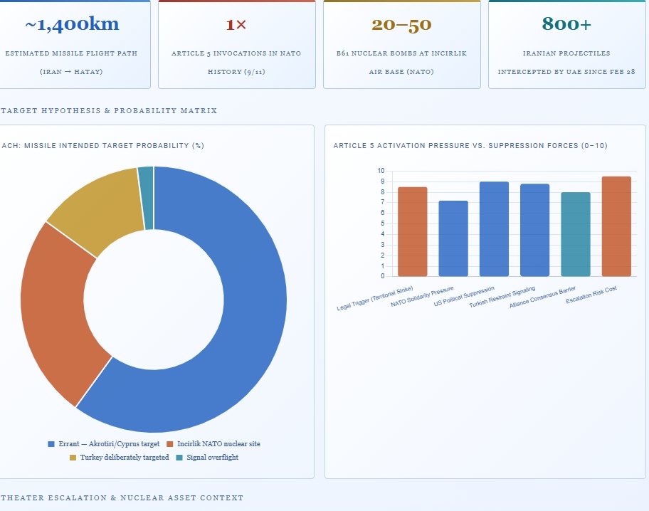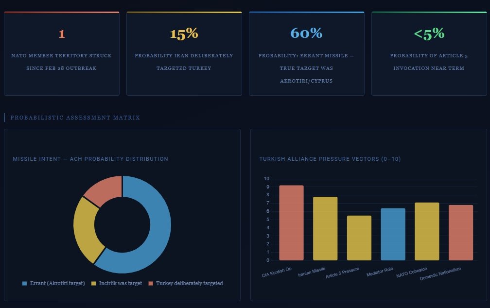 Συνολική εικόνα: Το πλήγμα Akrotiri φαίνεται κυρίως εκτροπή (errant, 60%) ή δευτερεύοντα στόχο, όχι σκόπιμη κλιμάκωση κατά Τουρκίας/ΝΑΤΟ homeland. Η χαμηλή πιθανότητα Άρθρου 5 δείχνει αποφυγή κλιμάκωσης από ΗΠΑ/Τουρκία, ενώ η μέτρια πιθανότητα ρήγματος ΗΠΑ–Τουρκίας (30%) συνδέεται με ευρύτερες εντάσεις (PKK/YPG, Incirlik).