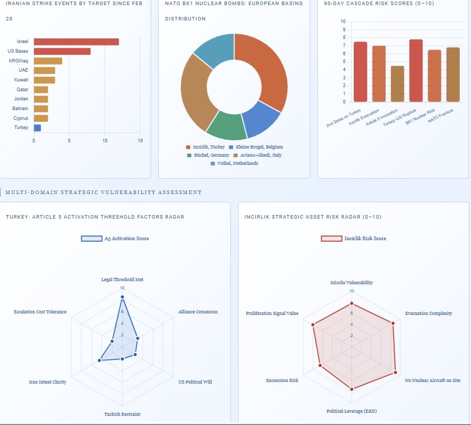 Ο σημαντικότερος μακροπρόθεσμος κίνδυνος κλιμάκωσης που ενυπάρχει στην επέκταση του στόχου του Ιράν είναι το διάνυσμα του Ιντσιρλίκ. Η Burcu Ozcelik, ανώτερη συνεργάτιδα στο Βασιλικό Ινστιτούτο Ενωμένων Υπηρεσιών για Μελέτες Άμυνας και Ασφάλειας, εκτίμησε: «Μια σκόπιμη ιρανική επίθεση σε μια βάση όπως το Ιντσιρλίκ θα ισοδυναμούσε με άμεση αντιπαράθεση με ένα μέλος του ΝΑΤΟ που διαθέτει έναν από τους μεγαλύτερους στρατούς της συμμαχίας». Οι δυνάμεις του ΝΑΤΟ καταρρίπτουν ιρανικό βαλλιστικό πύραυλο που κατευθύνεται προς την Τουρκία – The National – Μάρτιος 2026 Το Ιντσιρλίκ φιλοξενεί 20-50 τακτικές πυρηνικές βόμβες βαρύτητας B61 υπό την κατοχή των ΗΠΑ — περίπου το 33% των 150 B61 του ΝΑΤΟ που έχουν αναπτυχθεί στην Ευρώπη. Μια άμεση ιρανική επίθεση στο Ιντσιρλίκ δεν θα ενεργοποιούσε απλώς το Άρθρο 5 — θα δημιουργούσε την πρώτη μεγαλύτερη κινητική απειλή για μια πυρηνική αποθήκη του ΝΑΤΟ στην ιστορία της συμμαχίας, αναγκάζοντας σε άμεση απόφαση εκκένωσης των B61 υπό ενεργή απειλή πυραύλων, με τα αεροσκάφη να είναι πιστοποιημένα για τη μεταφορά τους να μην έχουν προκαθοριστεί στη βάση.