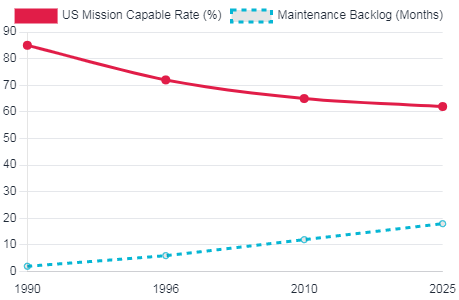 Συρρίκνωση Δομής Δυνάμεων Μεταψυχρού Πολέμου | Βάση Δύναμης (1991) μείωσε πτέρυγες (24 σε 15 ενεργές), αποσύροντας 900 αεροσκάφη χωρίς επανακεφαλαιοποίηση. | Τακτικές πτέρυγες: 24 (1990) σε 15 (1999)· 42/45 τύποι απέτυχαν MC στόχους από ΟΠ2011. | Προέλευση: Αναθεώρηση Άνω-Κάτω (1993) μέγεθος 1,5 MRC υπέθεσε διαδοχικές συγκρούσεις. Απόκλιση: $40 δισ. «μερίδιο ειρήνης» αποστρατεύτηκαν από συντήρηση. Μηχανισμός: Οδηγία AFMC 63-101 (1992) βέτο (45 ημέρες)· 10 U.S.C. §2304 προτεραιοποιεί μηδενικά ελαττώματα. | 85% MC (1990) σε 72% (1996)· απώλεια ισχύος $1,4 δισ. από ακινητοποιήσεις MOOTW. | Weapon System Sustainment: Aircraft Mission Capable Rates Generally Did Not Meet Goals and Cost of Sustaining Selected Weapon Systems Varied Widely – U.S. GAO – January 2021 gao.gov; USAF’s Capacity, Capability, and Readiness Crisis – Air & Space Forces Magazine – June 2025 airandspaceforces.com |