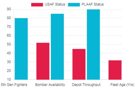 Η μέση ηλικία του στόλου της Πολεμικής Αεροπορίας των ΗΠΑ είναι 32 έτη. Η μέση ηλικία του στόλου της PLAAF είναι περίπου 15 έτη. Αυτός ο στόλος γεροντιατρικών αεροσκαφών απαιτεί εκθετικές ώρες συντήρησης, με αποτέλεσμα να φράζουν περαιτέρω οι αποθήκες.