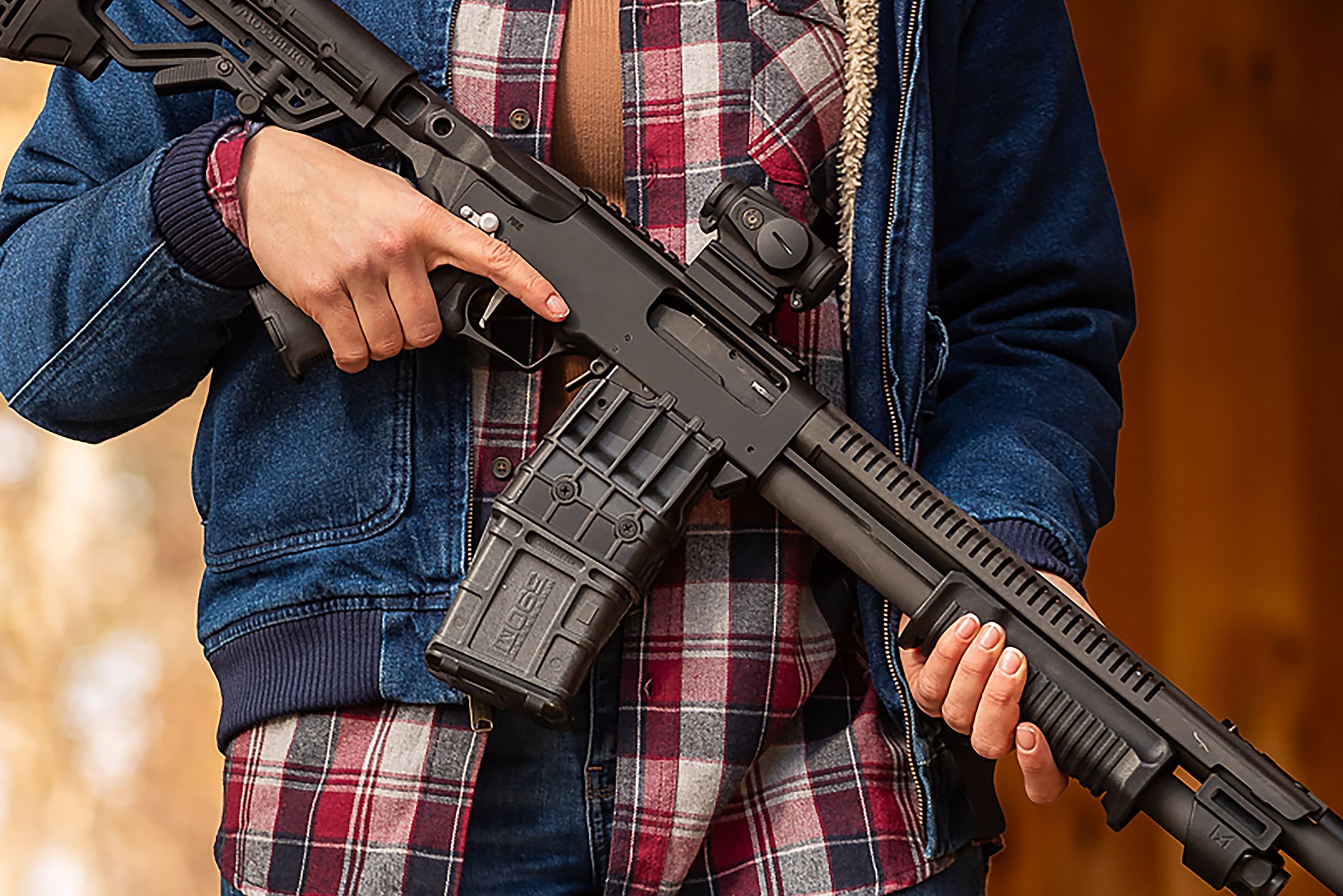 Τα όπλα 590RM Rotary Safety Selector χρησιμοποιούν τους πρώτους διπλούς γεμιστήρες παραγωγής που κατασκευάστηκαν για άντληση - παρέχοντας πιο αποτελεσματική χωρητικότητα σε σχέση με το μήκος σε σχέση με τα ανταγωνιστικά σχέδια. Επιπλέον, συνδυάζουν την δοκιμασμένη στο χρόνο ανθεκτικότητα Mossberg με πρωτοποριακά νέα χαρακτηριστικά όπως έναν περιστροφικό επιλογέα ασφαλείας, ένα συμπαγές, εργονομικά σχεδιασμένο μπροστινό μέρος και έναν ενσωματωμένο συνδυασμό κάννης/θερμοασπίδας. Δηλαδή δεν έχουν τόσο μεγάλο μήκος οι γεμιστήρες όπως βλέπουμε σε άλλα λειόκανα.