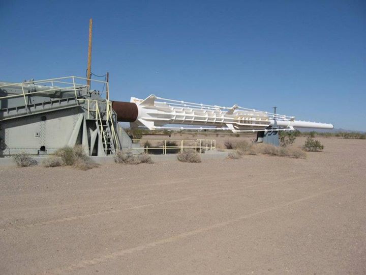 Ένα λευκό κανόνι πυροβολικού βρίσκεται οριζόντια σε ένα επίπεδο ερημικό τοπίο. Ένα άλλο πυροβόλο HARP στην έρημο της Αριζόνα.