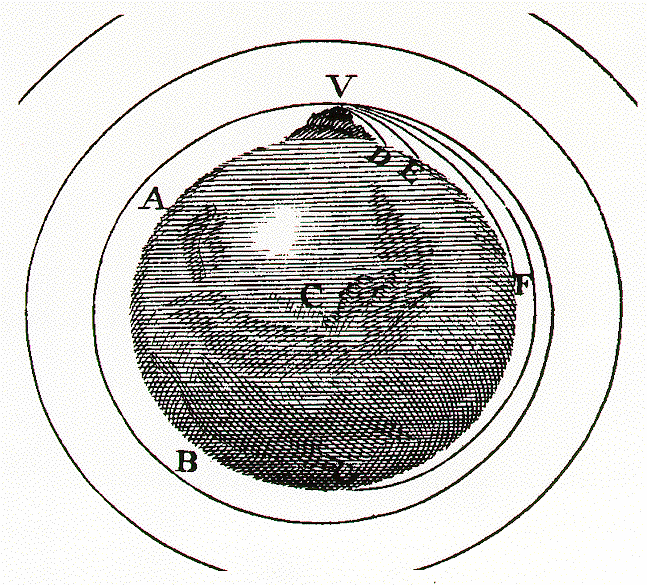 Φανταστείτε ένα βουνό τόσο ψηλό που η κορυφή του βρίσκεται πάνω από την ατμόσφαιρα της γης. Φανταστείτε στην κορυφή αυτού του βουνού ένα κανόνι, που βάλλει οριζόντια. Καθώς χρησιμοποιείται όλο και περισσότερο γέμισμα με κάθε βολή, η ταχύτητα της οβίδας θα είναι μεγαλύτερη και το βλήμα θα προσκρούει στο έδαφος όλο και πιο μακριά από το βουνό.