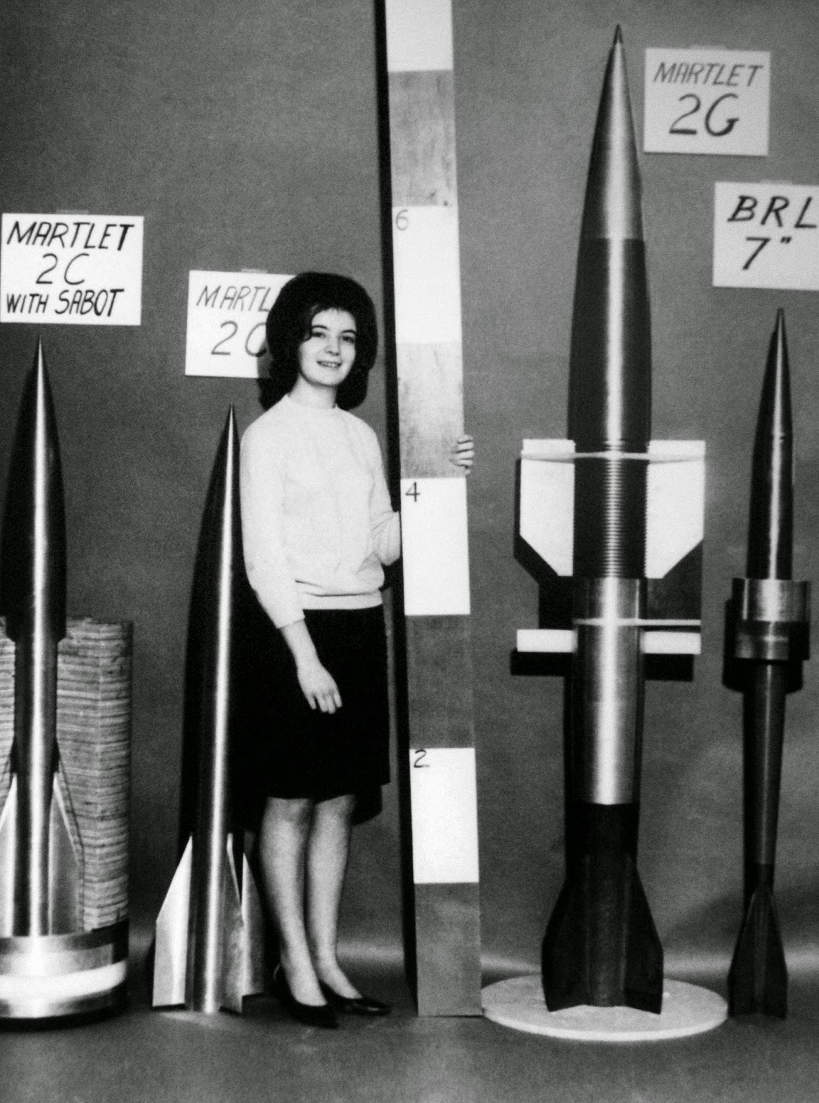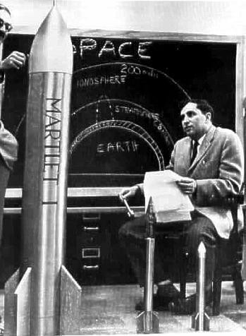 Ο Μπάροου κάθεται δίπλα σε έναν ασημένιο πύραυλο, περίπου στο μέγεθος ενός ανθρώπου. Το Martlet-1 - η πρώτη διαστημική σφαίρα.