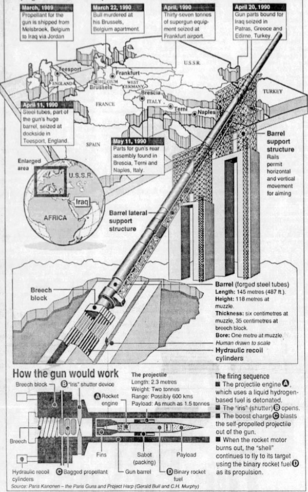 Το δεύτερο υπερόπλο, το «Big Babylon», ήταν πιο επιβλητικό, ωστόσο - ήταν το κανόνι των 512 ποδιών [156 μέτρων] που είχε ρίξει ο Bull για να ξεκινήσει το έργο. Αυτό προκάλεσε μάλλον μεγαλύτερη ανησυχία από τους στρατιωτικούς αντιπάλους του Ιράκ - το Ιράν και το Ισραήλ. Παρά το γεγονός ότι η ικανότητά του να εκτοξεύει συμβατικά βλήματα θα ήταν περιορισμένη και αργή, θεωρήθηκε απειλή.