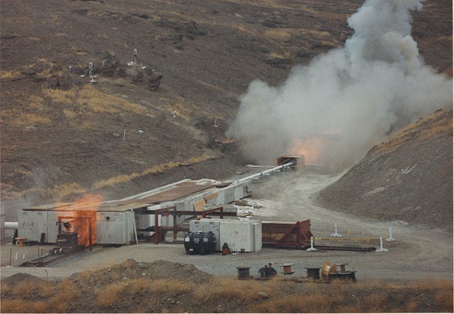 Ένα μακρύ κανόνι που βρίσκεται στον πυθμένα ενός φαραγγιού βάλλει οριζόντια σε ένα τσιμεντένιο μπλοκ. Έργο SHARP κατά τη διάρκεια δοκιμαστικής βολής στο Εθνικό Εργαστήριο Lawrence Livermore.