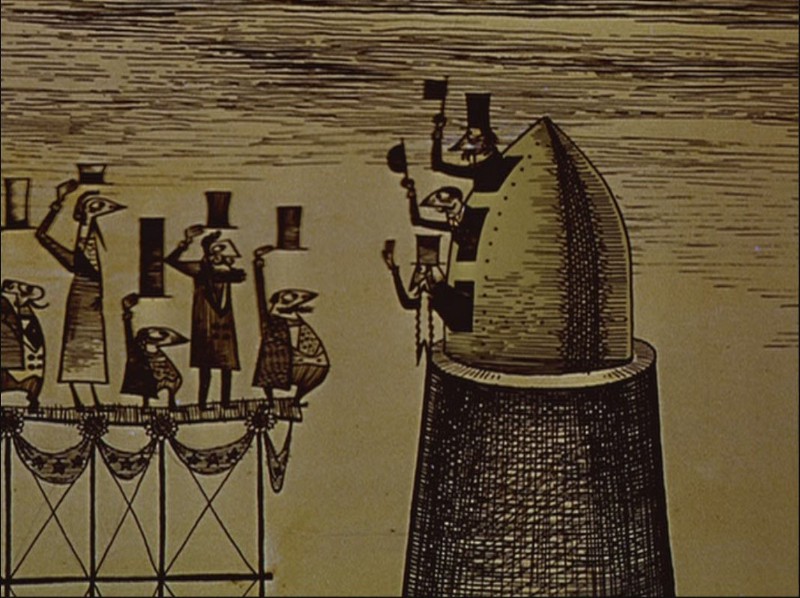 Ένα στιγμιότυπο από μια κινουμένων σχεδίων διασκευή του έργου του Ιουλίου Βερν «Ταξίδι στη Σελήνη», με άντρες με καπέλα να επιβιβάζονται σε έναν πύραυλο.
