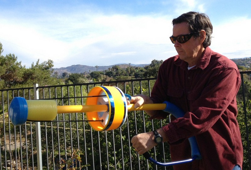 Ένας άντρας κρατάει μια κίτρινη πλαστική ράβδο. Στο άκρο απέναντι από τη λαβή υπάρχει μαλακή επένδυση και στα μισά του άξονα υπάρχει ένα μεγαλύτερο κίτρινο χείλος. Ο John Hunter, εκτοξεύοντας το Moonshot. Πίστωση εικόνας: John Hunter