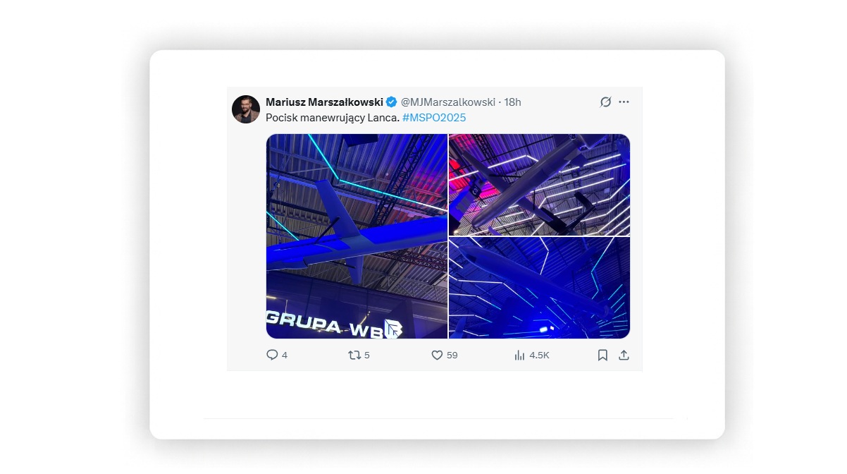 Στο MSPO 2025 στο Κίελτσε, το πολωνικό αμυντικό οικοσύστημα τόνισε δημοσίως την κυριαρχική ανάπτυξη μέσων πλήγματος, μια προσέγγιση που υπογραμμίστηκε από το Υπουργείο Εθνικής Άμυνας στις 2 Σεπτεμβρίου 2025, το οποίο πλαισίωσε μια βιομηχανική πολιτική για να «stawiamy na własne zdolności produkcji zbrojeniowej» («επενδύουμε στις δικές μας δυνατότητες παραγωγής οπλισμού») σε επίσημο ανακοινωθέν που τοποθέτησε τον εγχώριο σχεδιασμό και την κατασκευή ως στρατηγικό οικονομικό μοχλό· η δήλωση είναι διαθέσιμη στην πύλη gov.pl κάτω από το αρχείο ειδήσεων του Υπουργείου Εθνικής Άμυνας για τις 2 Σεπτεμβρίου 2025 και καθορίζει το πλαίσιο πολιτικής στο οποίο πρέπει να ενταχθεί κάθε νέα προσπάθεια πυραύλου κρουζ (Ministerstwo Obrony Narodowej — Wicepremier W. Kosiniak-Kamysz: Stawiamy na własne zdolności produkcji zbrojeniowej, September 2, 2025, Świętokrzyski Urząd Wojewódzki — Gala wręczenia nagród – ostatni dzień MSPO, September 5, 2025).