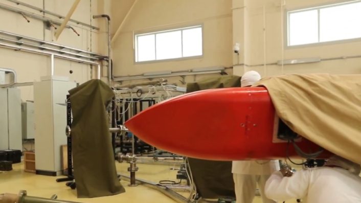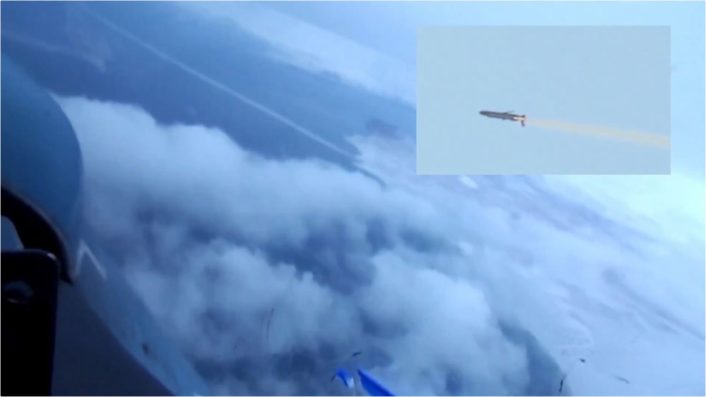 Στιγμιότυπο οθόνης που δείχνει τον πυρηνοκίνητο πύραυλο κρουζ 9M730 Burevestnik κατά τη διάρκεια δοκιμής την 1η Μαρτίου 2018, που καταγράφηκε εν πτήσει από ένα αεροσκάφος καταδίωξης. (Πίστωση εικόνας: Sputnik) Κοντινό πλάνο της μύτης του πυραύλου μέσα στα δοχεία έδειξε επίσης ένα πορτοκαλί χρώμα και ένα γωνιακό σχέδιο. Ένα βίντεο concept από το Sputnik δείχνει το όπλο να ακολουθεί μια διαδρομή σαν υπνάκο της γης γύρω από κοιλάδες και πάνω από κορυφές στον Αρκτικό Βορρά, και στη συνέχεια να πετάει πάνω από τον Ατλαντικό Ωκεανό, να διασχίζει τη Νότια Αμερική και στη συνέχεια να κατευθύνεται προς τη δυτική ακτή των ΗΠΑ.