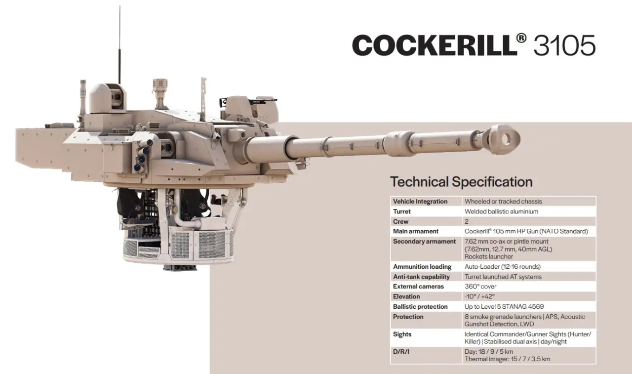 Ένα σημαντικό πλεονέκτημα, καθώς και κάπως μειονέκτημα, είναι η παρουσία ενός αυτόματου γεμιστή στο Cockerill 3105, ο οποίος χωράει 12-16 φυσίγγια, τα οποία μπορεί να μην είναι αρκετά κατά τη διάρκεια έντονων μαχών. Αλλά επιτρέπει τη μείωση του πληρώματος από τα τυπικά τέσσερα άτομα σε τρία. Όσον αφορά την προστασία θωράκισης, το Cockerill 3105 δηλώνει έως και επίπεδο 5 STANAG 4569, το οποίο το προστατεύει από φυσίγγια sabot 25 mm με σταθεροποίηση πτερυγίων που διαπερνούν τη θωράκιση. Και φυσικά χάνει σε αυτήν την παράμετρο από τον τυπικό πυργίσκο με πλήρη θωράκιση κατά βλημάτων με μέγιστο 180 mm.