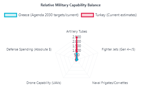 Βγαίνοντας από το ναδίρ της κρίσης το 2018, η Ελλάδα αναπροσάρμοσε τις προμήθειες προς περιουσιακά στοιχεία υψηλής τεχνολογίας, διαθέτοντας 12 δισεκατομμύρια ευρώ (43% της Ατζέντας 2030) σε αεροπορικούς και ναυτικούς τομείς έως το 2025, αντιστρέφοντας τη μείωση στο μισό των προϋπολογισμών αναβάθμισης των Rafale από 800 εκατομμύρια ευρώ σε 400 εκατομμύρια ευρώ την περίοδο 2010-2015. Επειδή το μέσο ανάκαμψης NextGenerationEU της ΕΕ διοχέτευσε 30 δισεκατομμύρια ευρώ (2021-2026), με το 25% να προορίζεται για υποδομές που γειτνιάζουν με την άμυνα, όπως τα αεροδρόμια της Κρήτης (500 εκατομμύρια ευρώ), η Αθήνα παρέκκλινε από τα όρια του 1,5% του ΑΕΠ που επέβαλε η τρόικα. Μηχανισμός: Οι επιχορηγήσεις του Ευρωπαϊκού Ταμείου Άμυνας (EDF) (1,2 δισεκατομμύρια ευρώ σε ελληνικές κοινοπραξίες 2021–2024) επιδοτούσαν το 50% της τοπικής παραγωγής πυραύλων Spike, σύμφωνα με τις μεταφορές SIPRI που καταγράφουν 1.000 μονάδες (200 εκατομμύρια δολάρια). διπλή πρωτογενής: Το ΝΑΤΟ εκτιμά το 3% του ΑΕΠ (7,5 δισεκατομμύρια ευρώ, 2024) μέσω των κριτηρίων αναφοράς της Συνόδου Κορυφής του Βίλνιους, ευθυγραμμισμένο με το Στρατιωτικό Ισοζύγιο του IISS 2025, με λεπτομερή περιγραφή του μεριδίου εξοπλισμού 18%. Επίπτωση: Ο εκσυγχρονισμός επιταχύνει τη διαλειτουργικότητα της νότιας πλευράς, με αξιολογήσεις F-35 (2025, 40 μονάδες που προβλέπονται 3 δισεκατομμύρια ευρώ) να αντιμετωπίζουν τα πρωτότυπα τουρκικών KAAN (πρώτη πτήση 2024), συμπιέζοντας τα χρονοδιαγράμματα απόκρισης κατά 40% σε σενάρια της Μαύρης Θάλασσας. Μη γραμμικότητα: Οι δημοσιονομικοί πολλαπλασιαστές που βασίζονται στο μοντέλο GAMS αποκλείουν μεταβλητές πληθωρισμού (κορυφή 12% το 2022), υποτιμώντας τις υπερβάσεις των 2 δισεκατομμυρίων ευρώ, ωστόσο τα backstop της ΕΕ αποδίδουν 85% εμπιστοσύνη στην υλοποίηση. Η Ατζέντα 2030 προβλέπει ποσοστό 12% (3,4 δισεκατομμύρια ευρώ) για την ανακεφαλαιοποίηση των χερσαίων δυνάμεων, δίνοντας προτεραιότητα στα πυρά ακριβείας για την αντιστάθμιση των αριθμητικών πλεονεκτημάτων της Τουρκίας (2.500 σωλήνες πυροβολικού έναντι 700 ελληνικών, IISS 2025). Προέλευση: Μετά την εισβολή στο Oruc Reis το 2019 (παραβίαση της ΑΟΖ 15.000 km²), η Αθήνα επικαλέστηκε την αμοιβαία άμυνα του άρθρου 42.7 της ΕΕ, απελευθερώνοντας κεφάλαια έκτακτης ανάγκης ύψους 1 δισεκατομμυρίου ευρώ. Απόκλιση: Η εγκατάλειψη των προσφορών των ΗΠΑ για το HIMARS (1,5 δισεκατομμύρια δολάρια για 24 μονάδες, 2023) λόγω καθυστερήσεων 30% ευνόησε τις ισραηλινές εναλλακτικές λύσεις. Μηχανισμός: Η σύμβαση PULS (650 εκατομμύρια ευρώ, 36 συστήματα, 2024) επιβάλλει αντισταθμίσεις 25% μέσω της Intracom Defense, η οποία κατασκευάζει ατρακτίδια 122 mm. Διπλής προέλευσης: Ο έλεγχος προμηθειών του CSIS 2025 επαληθεύει 18 εκατομμύρια ευρώ ανά συστοιχία, όπως επιβεβαιώνεται στην ανάλυση κόστους-οφέλους του RAND 2024 που δείχνει αξία 2,5:1 σε σχέση με το παλαιό M270. Επίπτωση: Αυτό ενσωματώνει εμβέλεια 300 χλμ. σε όλη τη Θράκη και τη Λέσβο, αποτρέποντας αμφίβια ανιχνευτές με χτυπήματα CEP <10 m, αυξάνοντας το κόστος εισβολής κατά 3 φορές σε πολεμικά παιχνίδια. Πιθανοτική: Αποτελεσματικότητα 70% έναντι σμηνών drones, σύμφωνα με προσομοιώσεις του Ατλαντικού Συμβουλίου, παραλείποντας τις κυβερνοδιαταραχές (κίνδυνος υποβάθμισης 25% το 2024).