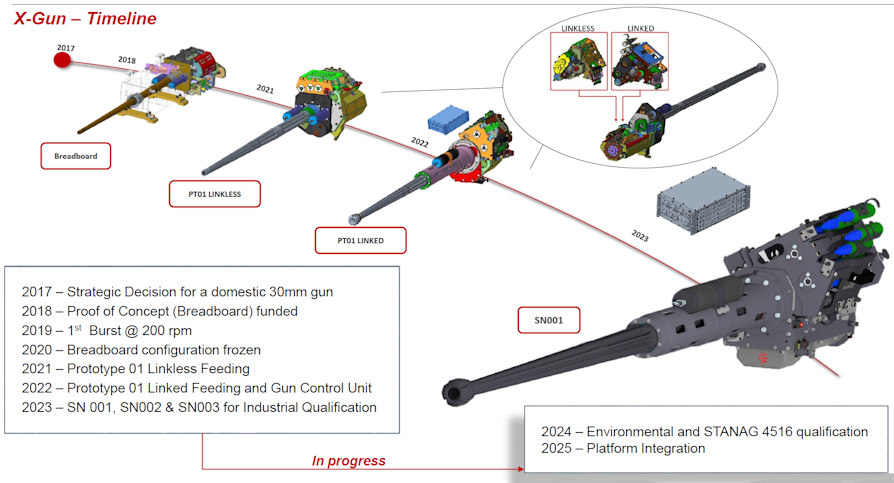 Η στρατηγική απόφαση για την ανάπτυξη ενός εγχώριου όπλου 30 mm ελήφθη το 2017 και το 2018 η εταιρεία χρηματοδότησε την δοκιμή της ιδέας, η οποία είδε την ανάπτυξη του μοναδικού εξαρτήματος που στη συνέχεια συναρμολογήθηκε, επιτρέποντας μια πρώτη ριπή βολής με 200 φυσίγγια ανά λεπτό το 2019. Το επόμενο έτος η διαμόρφωση πάγωσε, οδηγώντας το 2021 στο Πρωτότυπο 01, το οποίο διέθετε έναν διπλό τροφοδότη χωρίς σύνδεσμο, ένα σύστημα με το οποίο η εταιρεία είναι πιο εξοικειωμένη. Ένα χρόνο αργότερα, το ίδιο πρωτότυπο εξοπλίστηκε με έναν συνδεδεμένο διπλό τροφοδότη και ολοκληρώθηκε η μονάδα ελέγχου όπλου (GCU). κάντε κλικ στην εικόνα για μεγέθυνση