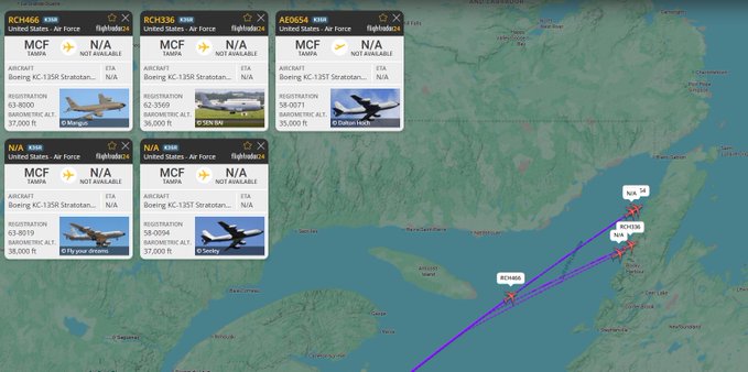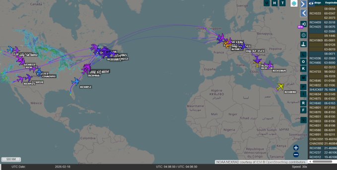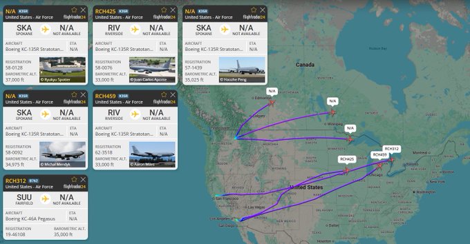 Πάνω από δώδεκα δεξαμενόπλοια εναέριου ανεφοδιασμού KC-135R/T της Πολεμικής Αεροπορίας των ΗΠΑ και KC-46A "Pegasus" συνεχίζουν να αναχωρούν απόψε από βάσεις στις Ηνωμένες Πολιτείες με κατεύθυνση ανατολικά προς την Ευρώπη, καθώς τα KC-135 από την αεροπορική βάση MacDill στη Φλόριντα - έξι συνολικά - ετοιμάζονται να διασχίσουν τον Ατλαντικό με προορισμό την αεροπορική βάση Vrazhdebna στη Βουλγαρία.